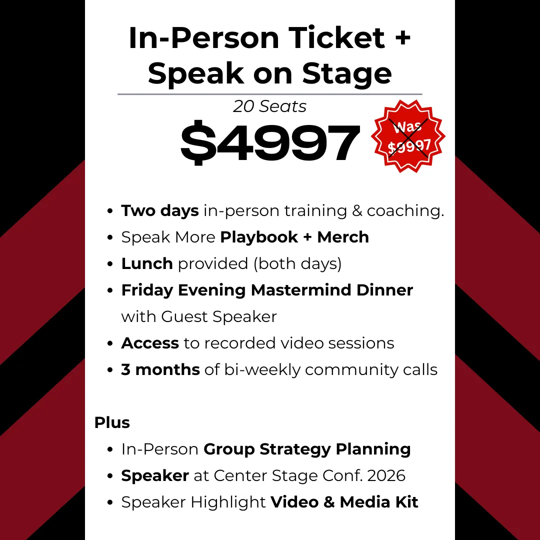 Ready For Center Stage is a hands-on speaker training event where we will walk you through the Center Stage Framework to craft and deliver a clear, compelling talk you can use for keynotes, podcasts, training, presentations, and interviews.